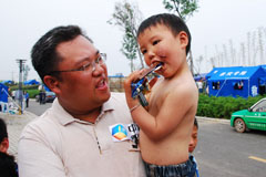 把金帝巧克力献给最需要帮助的人——灾区群众。5月15日,突击队兵分两路,一路由陈刚总经理带队,前往彭州市通济镇慰问,把40万元的巧克力送到灾区群众手中;一路前往广元市青川县慰问灾民,捐赠了124万元巧克力;5月16日,突击队分为三个小组,一组前往绵阳市九州体育馆和南河体育场慰问灾民,捐赠117万元巧克力,另外两组分别前往都江堰和彭州,捐赠74万元巧克力。在绵阳九州体育馆,最感动人的一幕发生了:当看到一个受了伤、正在哭泣的小男孩,接过突击队员递过来的金帝巧克力,津津有味的“狼吞虎咽”,开心的笑脸重新绽放在他稚气的脸上时,大家感到无比的快乐,陈刚总经理也不由自主的用双手托起了这个小孩,为救援行动留下了让人难以忘怀的感人瞬间。