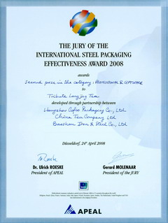 日前,在德国INTERPACK国际包装展会期间,欧洲钢铁包装协会(APEAL)在国际金属包装年会上颁布了三年一届的金属包装创新大奖。中粮包装有限公司设计生产并选送的“龙井茶包装礼盒”,被授予“2008年国际金属包装设计创新大赛--促销礼品类二等奖。”