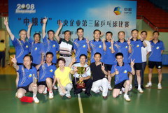 本届乒乓球比赛于2008年7月2日开幕、7月6日结束,共有41个中央企业报名参加。由集团办公室、中粮粮油、中国土畜、中国食品、中国粮油、台湾饭店等6个单位的14名员工组成的队伍代表中粮参加了比赛,并取得了男子A组团体第三名的好成绩。