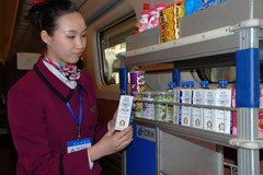 日前,蒙牛集团组织慰问团把带着节日温情的“特仑苏”牛奶送到了北京铁路局“和谐号”动车组正在加班、值班的乘务员们手中。
