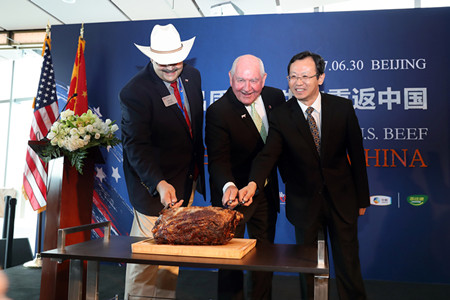 6月30日,美国牛肉重返中国市场庆祝仪式在美国大使馆举行。中粮集团党组成员、副总裁栾日成出席活动。主办方对中粮集团在美国牛肉进口事务上的专业和努力表示感谢,并邀请栾日成与美国农业部长Sonny Perdue、NCBA会长Craig Uden一起上台完成切肉仪式。