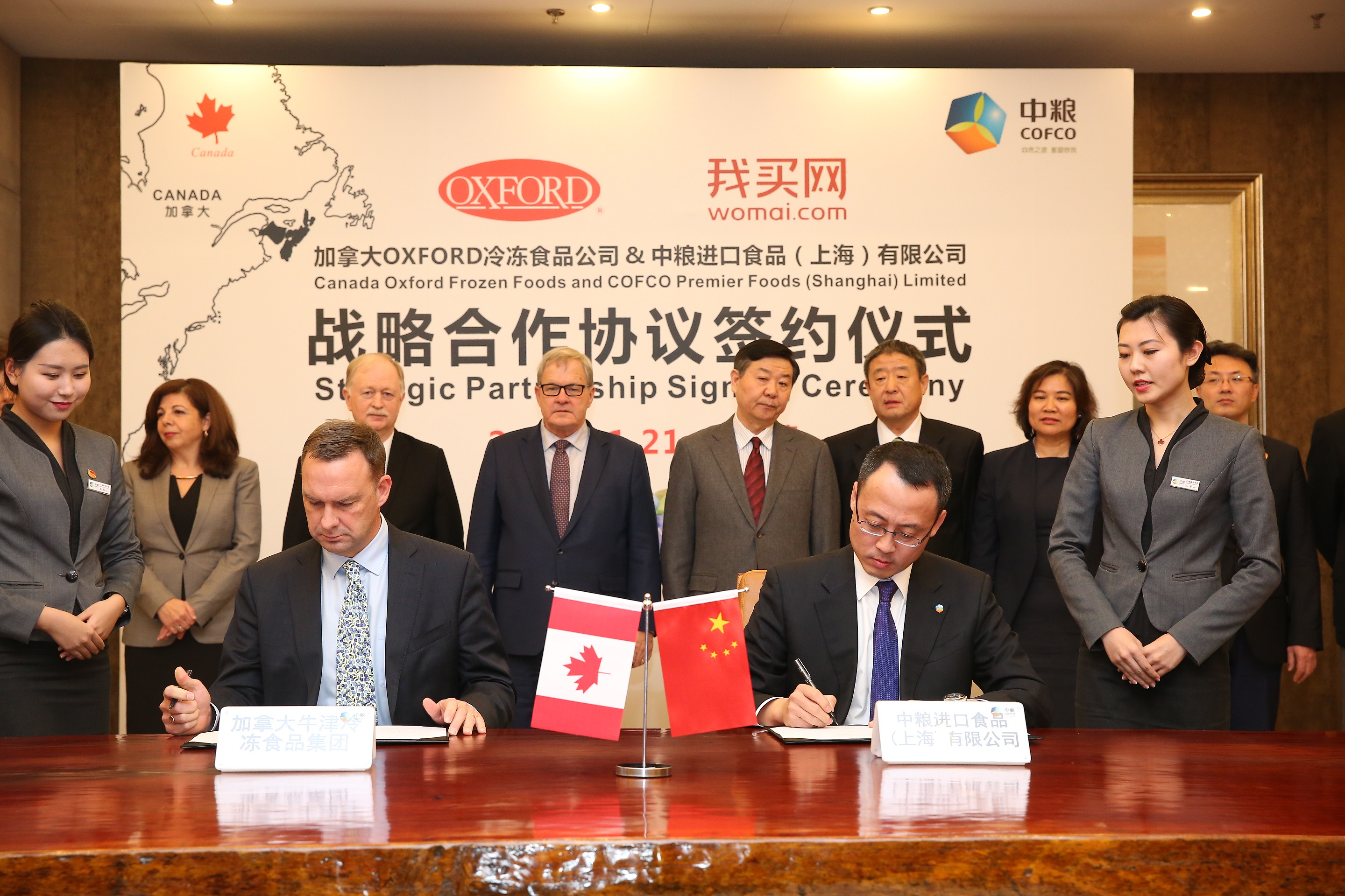 11月21日,在加拿大农业与农业食品部部长劳伦斯∙麦考利部长、加拿大新斯科舍省农业厅长基斯·科威尔,中粮集团党组书记、董事长赵双连和中粮集团总裁助理兼中粮我买网董事长张东风的共同见证下,加拿大Oxford冷冻食品公司副总裁麦谢尔·布莱格与中粮进口食品(上海)有限公司总经理王雪峰代表双方签署战略协议。未来,双方将通过B2B渠道共同为中国消费者提供优质、安全、健康的野生蓝莓和相关产品。